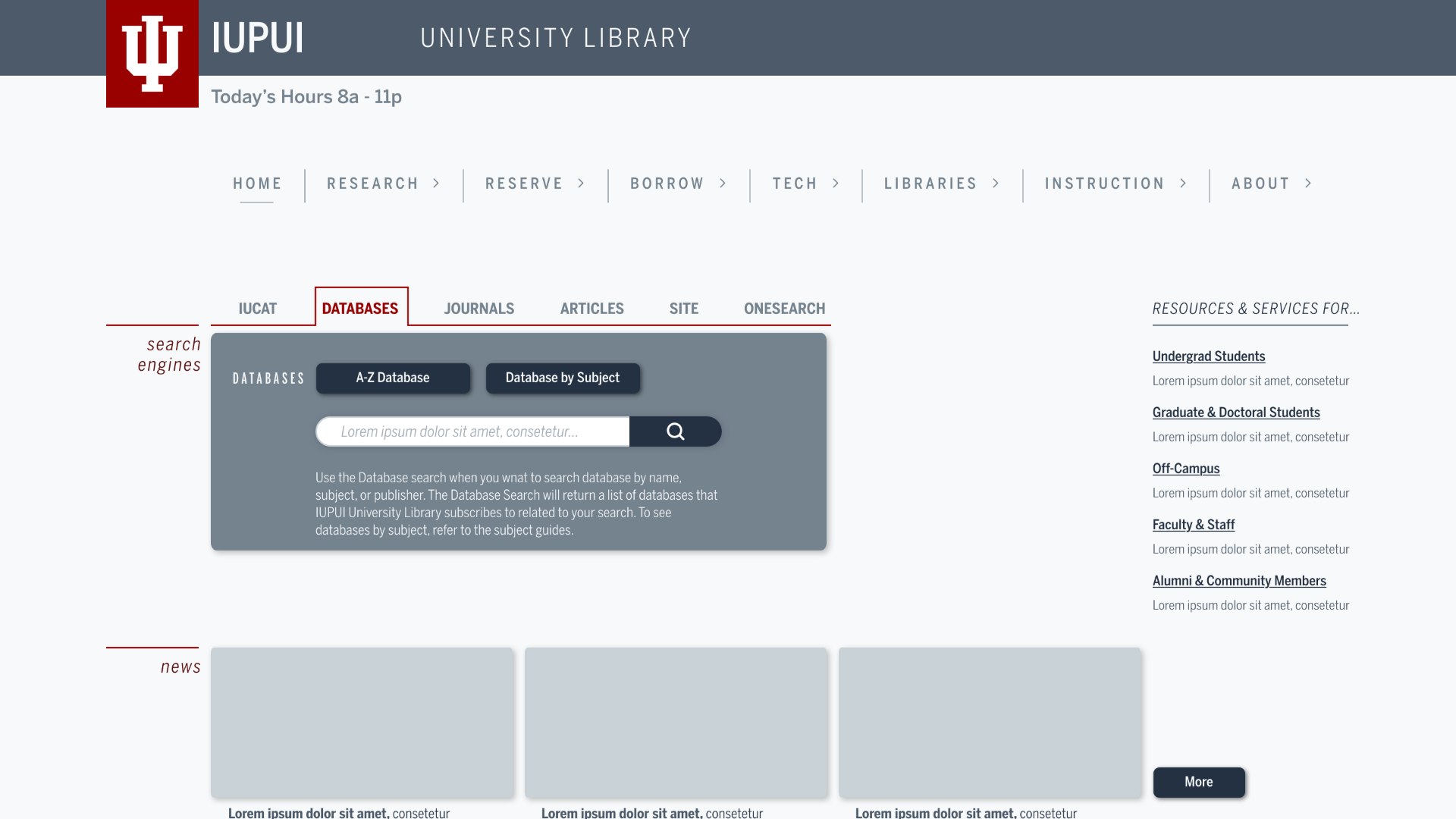Top Moved title to banner. Hours upper left. Added a HOME link. Added LIBRARIES to dropdown categories. Intend to add Databases, Journals, and Article link to RESEARCH dropdown.
