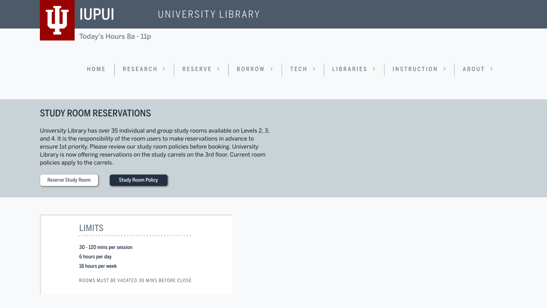 Selected “Reservations” dropdown. Selected “Study Rooms.” Found time limit in body copy.”